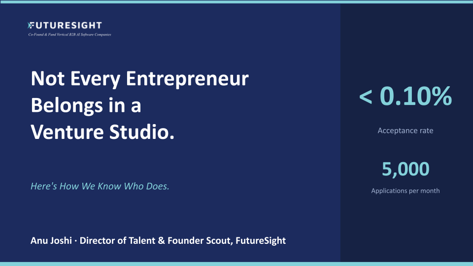 Every month, 5,000 entrepreneurs apply to become an Entrepreneur-in-Residence (EIR) at FutureSight. We speak with 50 of them personally. Approximately 12 to 13 make it to the next stage – a conversation with a FutureSight Partner. From this, we onboard between 2 to 4 EIRs every month who begin co-building a vertical B2B AI software company alongside us.